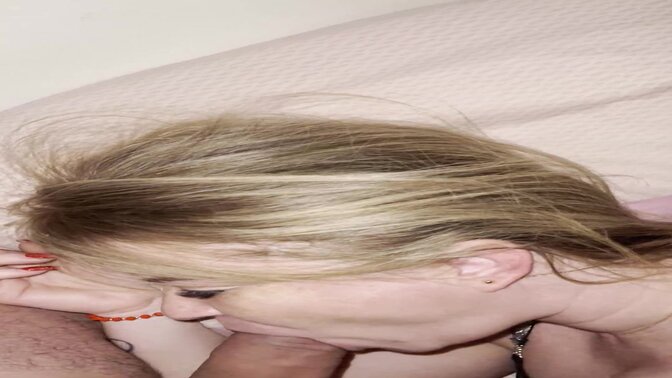 Sexy blonde babe deep throats her boyfriend's big cock in bedroom